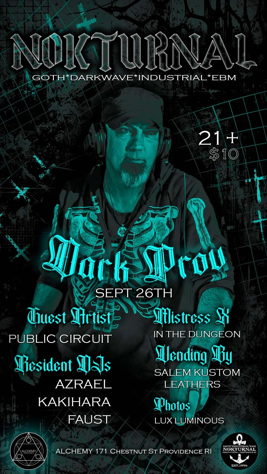 In 1996, DJ Gabriell was stranded in a blackout at a seedy warehouse somewhere between Boston and Providence, armed with nothing but a suitcase of goth records, his last cigarette, and a half working turntable. As the storm howled outside, Gabriell lit his cigarette and began looping samples on PA system jacked from a funeral home. The walls shook. Shadows danced. A mysterious figure in velvet boots appeared from the dark and whispered, “Build the night.” When the power came back, Gabriell emerged with a vision: a dark haven of sound and style, a gathering of night creatures draped in lace and leather. And so Nokturnal was born.